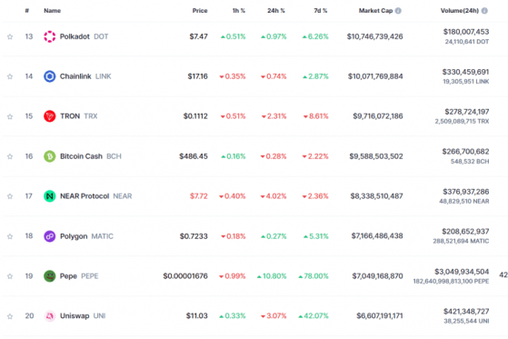 Мемкоин PEPE продолжает поражать инвесторов своей динамикой, достигнув рыночной капитализации в 7 миллиардов долларов и заняв место среди двадцати крупнейших криптовалют в мире. Такой впечатляющий рост стал возможным благодаря недавнему достижению исторического максимума стоимости монеты на уровне 0,00001161 доллара, что открыло новые горизонты для энтузиастов и трейдеров.